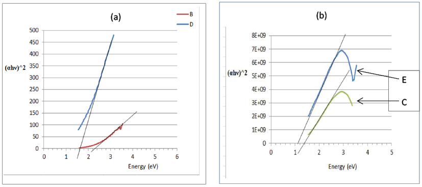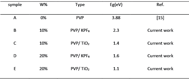 Where, r is equal to (1/2, 2/3, 2 or 3) and ,Eg, is the optical energy band gap. The plot of (αhν)2 versus the energy (photon energy) are shown in Fig. 4, from figure we determine the energy gap by intercept with x-axis and its increases with increase the weight ratio each of KPF6 and TiO2 nanocomposite (Table 3). From table we see that the added of TiO2 nanocomposite to polymer PVP was better than added KPF6 salt as thin films that clear in value of the energy gap.