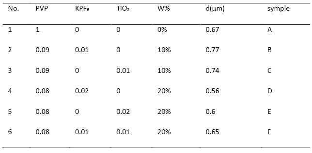 The electrolyte solution of polymer PVP were prepared by dissolving PVP with each of KPF6 and TiO2 in distal water for different weight ratio (0, 10, 20) %. This solution was mixing using hotplate stirrer for 120 min with 600rpm at room temperature. After that thin film for different weight ratio was then prepared on glass substrate (1.5 X 2.5) cm2 by cast Solution method and put at room temperature for (24 h.) to get polymerized homogeneous solid films of doped polymer PVP. The solid thin films were put on hot plate for 30 min to do annealing for it at 70oC. To measure thickness of the films was that by using (digital thickness gauge meter) where the films put on the stainless steel substrate, table 1 describe the weight ratio with thickness for all types of thin films. The optical measurements were recorded at room temperature using (T80-uv/vis. Spectrophotometer) in wavelength range from (300-800) nm
