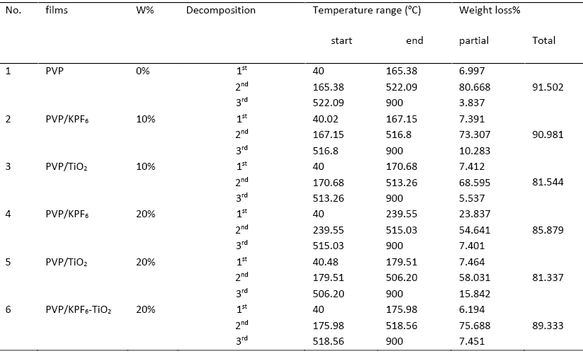 For study TGA, If we compared between PVP and all films that containing on KPF6 and TiO2 for different weight ratio we see that the weight loss was decreases with increase of weight ratio for added KPF6 but it’s don’t effect with increase TiO2 nanocomposite. For study Absorption spectra, we see that the best result was for added TiO2 nanocomposite to polymer PVP if we compared it with KPF6 salt, where the maximum absorption was (0.838) for added TiO2 nanocomposite but for added KPF6 salt the absorption value was (0.076).