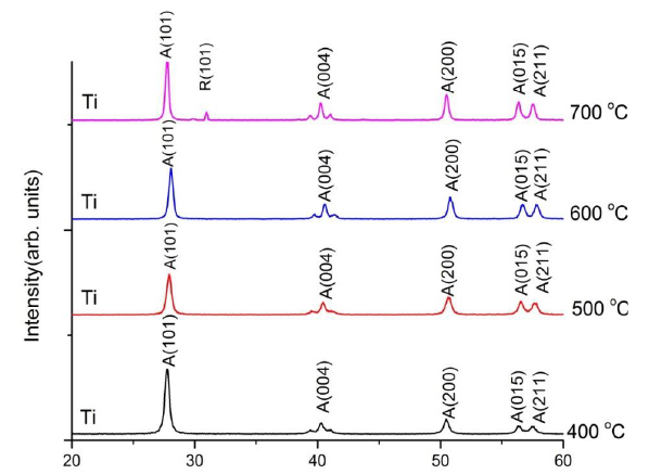 The XRD of the TiO2 NPS at 400, 500,600, and 700 °C calcination identify the peaks of anatase (A) and rutile (R) phases. (400, 500, and 600 °C) show the anatase only 700 °C present anatase-rutile phase at (700 °C). However, the pattern shows that and at ( 400 °C) has three broad peaks at 2ϴ equal 27.757̊, 40.303̊, and 50.451̊, with (101), (004), and (200) diffraction planes, respectively. The sample calcination at (500 °C) has three broad peaks 2ϴ angle at 27.900̊, 40.451̊, and 50.602̊ with (101), (004), and (200) in the plane of diffraction, each time. The NPS of calcination at all the temperatures was determined as indicated in the Scheme. 1 that prove we get the perfect structure of TiO2 NPS. However, the slight change may be drawn to the interaction processor to combine two phases in the same part-scale (Fig. 1).