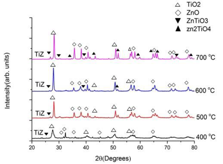 Fig. 2 shows the XRD result of NPs prepare at different treatments, which reveals ZnO and TiO2 in all the samples. The ZnO may be found in the samples as zincite-phase TiO2 Titania is in the anatase phase with no polymorphs present. Polymorphic titanium dioxide was discovered by examination of the sample, but no additional polymorphs were found. It is clear that the TiZ400 pattern that (101) happened to be the most potent reflection of both ZnO and TiO2. A gradual reduction from TiZ400 up to TiZ700 for mole fraction is observed in Fig .2. According to Fig. 2, heat treatment from 400 up to 700 ◦C decreases the intensity of the (101) plane of Anatase, while (002) ZnO plane rises slowly. It shows that atoms of Zn on the (002) plane were ideally replaced by atoms of Ti and the formation of a ZnO/TiO2 the solid solution has been continued gradually by the increase of calcination temperature. By increasing temperature from 400 up to 700 ◦C, the intensity of ZnTiO3 is getting a gradual decrease.