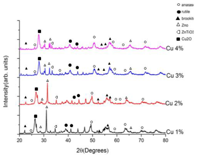 XRD showed the structures of Cu: ZnO/ TiO2 indifferent TiO2 and ZnO level and temp. Fig. 3 shows the XRD of the samples consist of 1–4 wt% copper, temp at 500 °C (Fig. 3). Zinc Oxide Quality JCPDS (reference code 98-002-9272), crystal phases of TiO2 including anatase (00-021-1272), Rutile (01-075-1750) and Brookite (00-029- 1360), Cu2O (00-05-0667) and CuO (00-48-1548) Are used to determining trends. Cu: ZnO/ TiO2 with copper loading of 1 wt% that temp at 500 °C. It crystallized in a matrix as Fig. 3, among TiO2 crystal structures, Anatase diffraction peaks showed the Strongest intensities at 500 ° C after calcination, Indicating their main phases inside the photocatalyst at this point. In the meantime, signs of rutile are also observed at 500 ° C in Cu: ZnO / TiO2 calcination. Using the sol-gel method, anatase structure is generally generated in TiO2 synthesis. However, rutile is stable, whereas brookite and Anatase are metastable. Besides TiO2 crystals, ZnO with peak intensities of intense diffraction are found in these photocatalysts. However, several ZnO In this study peaks based not identifiable on standard peaks. The findings proved that photo-depositional modification was successful. ZnO’s basic crystal structure and its transformation into ZnTiO3 or ZnTiO4. In this instance, it may be owing to the even dispersion of copper nanoparticles. ZnO surface. On the other hand, the presence of a high amount of zincite in the calcination of samples at 500 ° C indicated that the transformation mentioned above for photocatalysis at that temperature was not fully achieved. According to the Fig. 3, Signals of Cu2O (26.393 °) was detected, and the amplitude of these peaks increased with the concentration of copper, which explained the higher mass proportion of Cu2O with copper heating. However, Cu2O the o diffraction pattern is not observed as CuO Or due to the XRD detection cap, the limited size of Cu components. Another potential explanation may be a strong CuO dispersion inside the TiO2 frameworks.