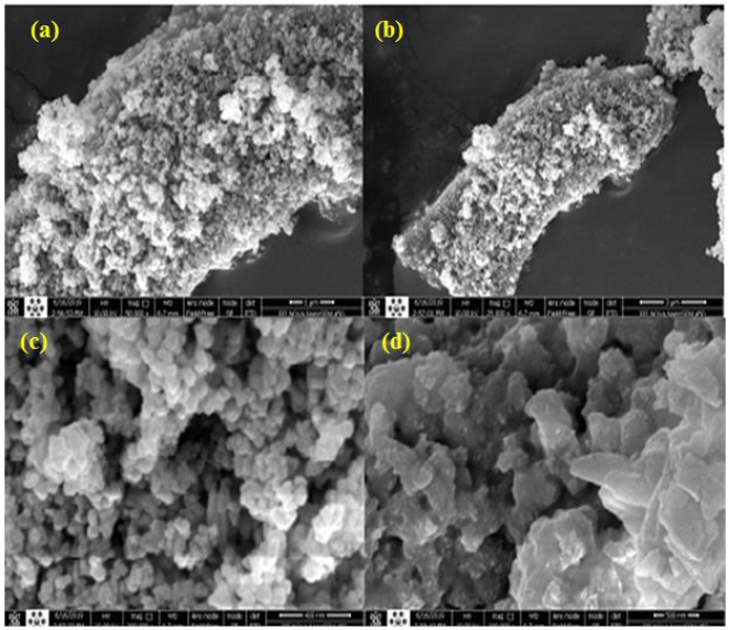 Fig. 5 shows the top surface of the ZnO/ TiO2 nanocomposites, which demonstrates the relationships to crystallography among the TiO2 nanoparticles and ZnO nanorods template. For the nanocomposites, TiO2 nanocomposites prepared by the thermal method at 500 °C, The average particle size of the composites is about 500 nm. The FESEM images show the uniform sizes of the nanocomposite particles prepared at 500 °C temperatures. Also, FESEM images provided additional information, including the structures and surface morphologies of the as-prepared nanomaterials. As shown in Fig. 5, by taking the best samples at temperatures on calcination (500 °C) with magnification (a-1µm),(b-3µm), (c-400µm), and (d-500µm) As for the as-prepared ZnO/ TiO2 nanocomposite (TiZ500, a-1µm), it can be seen that TiO2 nanoparticles are well distributed over ZnO nanorods (Fig. 5-a), which also indicated that the original Building and shape of the TiO2 nanoparticles and ZnO nanorods are well preserved during the preparation of the ZnO/TiO2 nanocomposites.