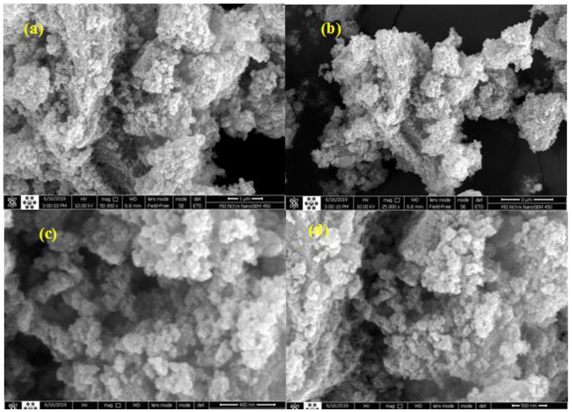 Surface morphology and growth of the NPS is Reviewed by the Field Emission Scanning Electron Microscopy (FESEM)., Fig. 4 shows the surface morphology of the TiO2 NPS samples calcination at 500 °C at different magnification. The average particle size is calculated as shown in Table 1. The results show the larger particle size with a high uniform morphology for calcination of the samples at 500.