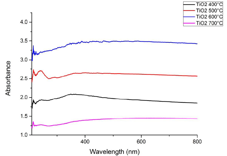 UV–Vis diffuse reflectance spectra analysis the optical absorption properties play an essential role in evaluating the photoabsorption ability of photocatalyst. Fig. 8 shows the U.V.–Vis diffuse reflectance spectra of as-prepared samples ZnO/ TiO2 at (400-700) ◦C temperatures. U.V. absorption was dominant across the span of nearly the whole U.V. spectrum. (λ=233 nm) at 700 ◦C, and the weak absorption happened in the visible region for ZnO/TiO2 at 400 ◦C . Furthermore, the absorption edge spread into the visible light range when temperatures increased. Furthermore, when temperatures increase, the absorption edge spreads into the visible light range. ZnO/TiO2 at 500◦C and 600 ◦C. Notably, the absorbance intensity of ZnO/TiO2 at 600 ◦C in the visible light region is more vital than that of ZnO/TiO2 500 ◦C, which illustrated those doping zinc elements facilitated the extending of optical absorption toward the visible light region.
