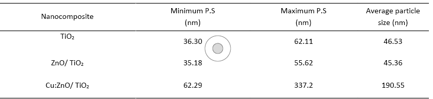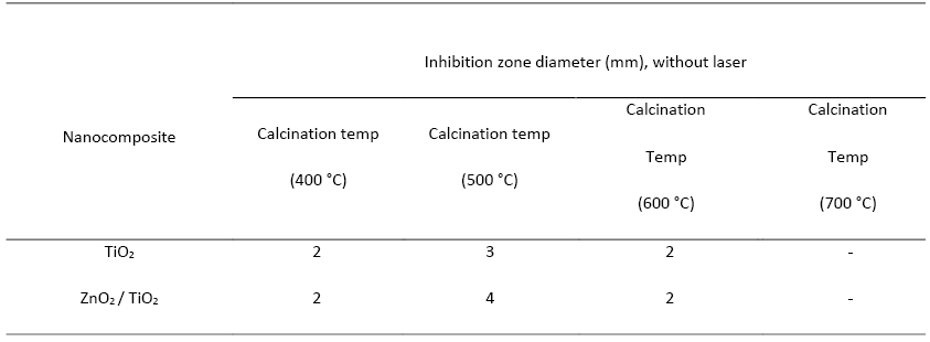 Disc diffusion to measure the antibacterial activity of nanoparticles, it was completed. ZnO/ TiO2. Inhibition zone diameter indicated that ZnO/ TiO2 in 500 °C had a more significant antimicrobial effect against bacteria compared to the combination of individual nanoparticles with 400 °C, 600 °C, and 700 °C. Based on the results, S. aureus bacteria were more sensitive to the antimicrobial agents in ZnO/ TiO2 more than. The primary purpose of using ZnO as a nanocomposite with TiO2 Is to control their release of and increase the antimicrobial activity. The permeability of both the cell wall and the cell membrane is disrupted by nanoparticles, thereby interfering with DNA replication and protein synthesis.