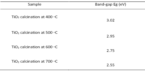 Fig. 7 shows TiO2 nanoparticle at temp (400) ◦C at (410) nanometer attributed to the band gap is 3.02 eV with delicate anatase phase and show highly crystalline nanomaterial. The TiO2 samples calcination at 500 ◦C, 600 ◦C and 700 ◦C show absorption at the wavelength (420) and (450) nanometer. At high temp, the TiO2 is change the absorption from UV to visible light.
