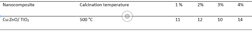 Photocatalytic activity and antibacterial experiments were executed Cu doped ZnO/ TiO2 at 1%, 2%, 3%, and 4% with a temperature of 500 ° C.In addition, this data was compared to new results. TiO2 and ZnO/ TiO2. The samples were evaluated with bacterial strains S. aureus. The bacterial Inhibition zone diameter significantly Is increasing at 1%, 2%, and 4%. The bacterial reduction was achieved in the presence of Cu doped samples in 3%. the inactivation observed is a synergetic effect of TiO2 As well as Cu ions in the presence of visible light were introduced and led to enhanced absorption efficiency, which made bacterial inactivation faster, as shown in comparison to control samples.