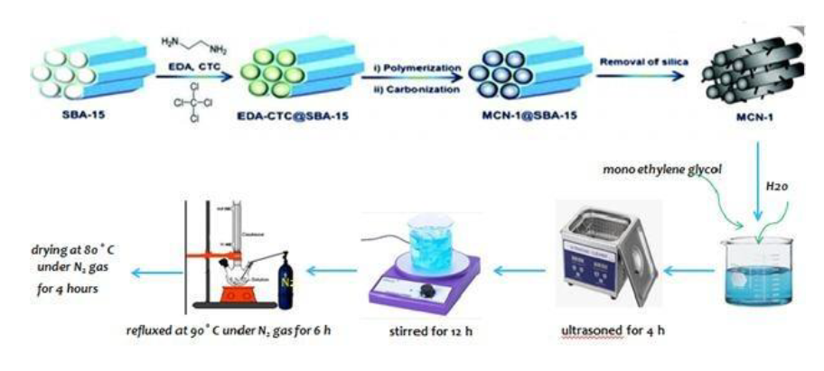 A Mesoporous carbon nitride catalyst base was prepared by adding SBA-15 to a mixture of ethylenediamine, and carbon tetrachloride under magnetic stirring at 90 ° C for 6 hours. The resulting mixture was then dried for 12 hours and then placed in a furnace under nitrogen at 700, 800, and 900 ° C for 5 hours. To remove SBA-15 silicate plates, sample with 5% HF by the weight smoothed and then After filtering, washing with ethanol, and drying at 100 ° C, the MCN catalyst base was obtained.[18]
