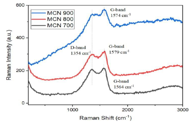 The Raman spectra of MCN samples are shown in Fig.4. For all specimens, corresponding to sp2-based irregular carbon and graphite, respectively, two distinct peaks appeared at about 1354 and 1570 cm / m. For the sample prepared at 700, 800, and 900 ° C, ID / IG values of 1.81, 1.01, and 0.69 were obtained, respectively. From Raman’s results it can be inferred that with increasing temperature, the degree of graphitization (G-bond) of MCN samples has increased, which may lead to the destruction of the MCN structure.