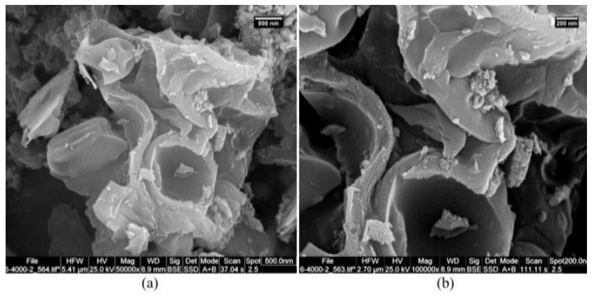 The FESEM images of the MCN catalyst support provided at 700 ° C are shown in Fig. 6. As can be seen, the morphology of MCN was curved shells. According to previous researches on MCN synthesis and analysis, the synthesis has been done correctly.