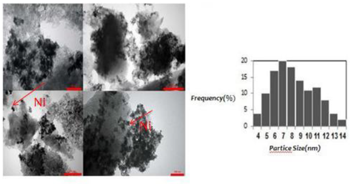 TEM images of MCN uploaded by active sites are shown in Fig. 7. In this figure, it is clear that Ni nanoparticles are loaded on the MCN. Particles accumulate inside the graphite lattice more than outside the lattice. In the case of the Ni / MCN sample, the TEM micrograph shows that the maximum Ni nanoparticles were 5-11 nm in size. For this example, the homogeneous distribution of active metal sites can be detected, which can be effective in the hydrogenation reaction of acetylene, while providing sufficient active sites and preventing the adsorption of excess reactants, thereby increasing the choice of ethylene.