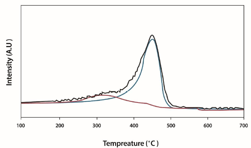 The TPR results of Ni-MCN nanocatalyst are shown in Fig.9. The main peak in 300.4 is divided into three distinct peaks. Other peaks are related to impurities. The amount of hydrogen used to reduce nickel species, in theory, is 10.3 micromoles H2 / g. Using the level below the peak, a diagram of 0.07 mmol has been obtained. The difference between these two values is related to the partial reduction of nickel-metal during synthesis by the poly method. The presence of nickel species has also been observed in the XRD analysis. A peek at 450related to metal impurities was reported in the sample.