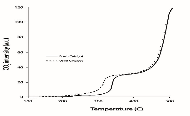 Temperature-programmed oxidation (TPO) of the nanocatalyst used in this study showed that very little coke was deposited on this material (Fig. 14). Finally, it was confirmed that no adverse reaction for oligomer formation of coke deposition in the nanocatalyst studied in This did not happen. In Fig. 12, the small amount of CO2 detected at low temperatures may indicate the adsorption of carbon species on the catalyst.