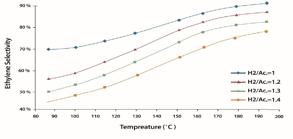 By increasing the temperature or decreasing the H2 / AC molar ratio, the selectivity to ethylene improves. These changes lead to the formation of more carbon species on the catalyst