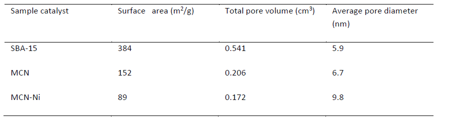 As can be seen, SBA-15 had a high SBET which decreased in MCN as well as Ni / MCN samples. The decrease in SBET in the Ni / MCN sample compared to MCN is attributed to the blockage of some pores, which is also evident in the reduction in the total pore volume. The higher the nickel loading percentage, the higher the selectivity of nickel. The large mesopores are effective in loading metals and active sites that the formation of undesirable products and green oil due to the reaction inside the cavities, which causes the canal to be deactivated. Also, The specific surface of the commercial catalyst was 40 m2/g along with a mean pore diameter of 30 nm.