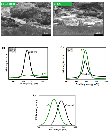 To investigate the influence of LC on tin oxidation, the XPS result for control film and LC film was compared (Fig. 3 c and 3 d). The XPS plot shows the binding energy of 486.6 eV for Sn4+ and the binding energy of 486.0 eV for Sn2+ species. It can be seen lower Sn4+ peak for LC film than that of the control film, indicating LC can noticeably prevent tin oxidation. Steady-state photoluminescence (PL) of control film and LC was displayed in Fig. 3e to reveal the charge transfer behavior of fabricated films. The PL spectrum demonstrated a blue shift for LC film which can be attributed to alteration of nanocrystal structure at the superficies [30] and reduction of spontaneous radiative recombination among trap states which is likely the reason of increased VOC [32, 33].