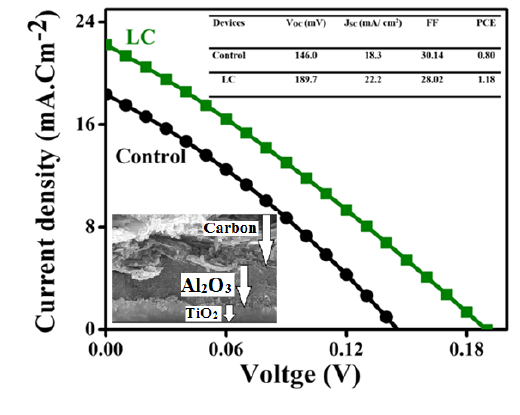 A mesoscopic carbon-electrode tin-based perovskite was prepared to examine the influence of LC additive on the photovoltaic performance. In this purpose, photocurrent-voltage curves (I-V) were recorded for control cells and LC cells (Sn-PSCs prepared with perovskite solution and additive). Fig. 4 demonstrates the I-V curves along with calculated photovoltaic parameters for two kinds of cells. The control cell exhibited a small amount of PCE (0.80%), however, in the LC cell, it can see an improved PCE of 1.18%. The improvement of PCE can be ascribed to enhance VOC and JSC parameters because of suppressing tin oxidation, improvement of crystallinity and film quality according to XPS, XRD and SEM results, respectively.