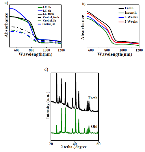 The stability is one of the most important factors to investigate the PSC functions. Fig. 5a displayed the UV-vis spectra for control and LC film after leaving them in the ambient with 30% humidity at different hours. In addition, long-term stability was examined after leaving LC samples on 1 week, 2 weeks, and 1 month in GB, (Fig. 5b). UV-vis results indicated that the fabricated films by LC additive show better stability than that of control. Fig. 5c illustrates XRD patterns for fresh and old prepared LC films. The control film was quickly decompose to SnI4 [15], but those with LC were stable around two weeks. These results reveal that using LC not only can reduce Sn2+ oxidation, but also can improve stability.