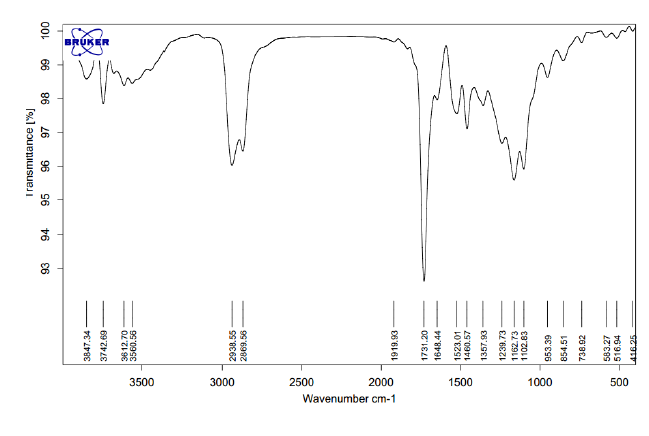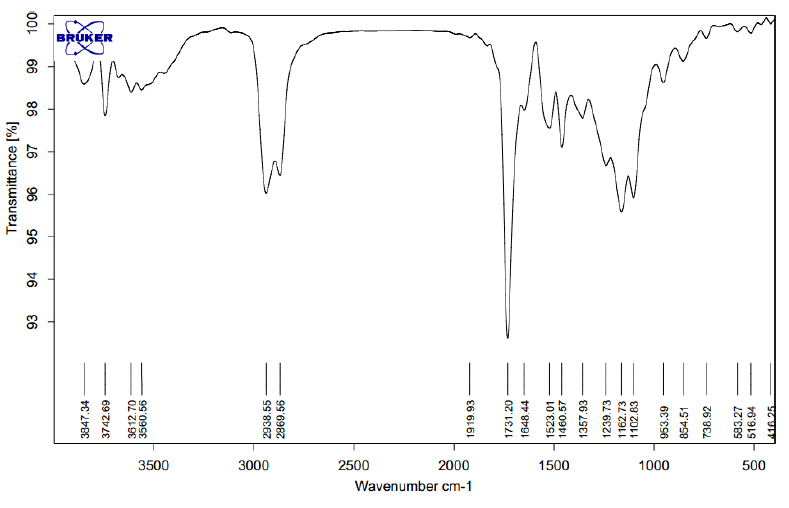An absorption band in 1731 cm-1 represents the stretching vibration of the ester band of the main polymer chain. Absorption bands at 1116 cm-1 and 1246 cm-1 are the stretching vibration of the C-O-C band of -OCH2CH2 units of Polyethylene glycol and -COO- band of polymer chains. Also absorption bands at 2944 cm-1 and 2866 cm-1 are special bands for stretching vibration of C-H bands of -CH2CH2 of caprolactone. An absorption band in 3742 cm-1 indicates the end hydroxyl group of PCL-PEG-PCL.