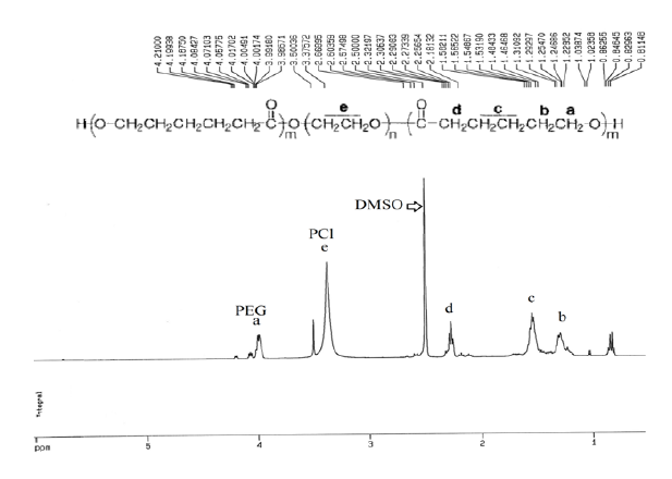 As shown in the 1H-NMR spectrum for the synthesized copolymer, the chemical proton displacement of 1.24, 1.3, 2.2, and 4.06 belongs to -(CH2)3, -OCCH2- and -CH2OOC in polycaprolactone. A sharp peak in 3.37 ppm belongs to the chemical displacement of polyethylene glycol protons. Chemical displacements in 3.9 ppm to 4.2 ppm are due to -O-CH2-CH2 protons of Polyethylene glycol attached to polycaprolactone [11-12].