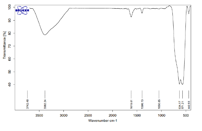 Fig. 6 shows the FT-IR spectrum of magnetic nanoparticles of Fe3O4. The FT-IR spectrum of magnetic nanoparticles of Fe3O4 shows an intense absorption band at a frequency of about 571 cm-1 for FeO and a frequency of 3382 cm-1 for OH functional group.