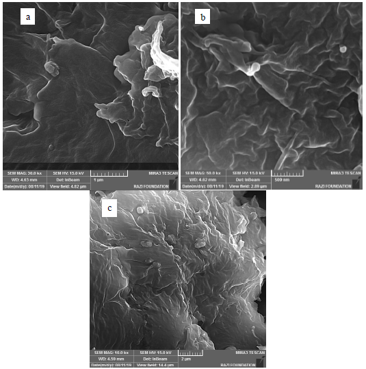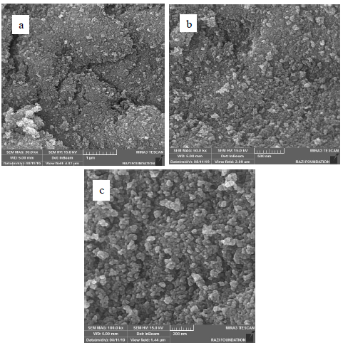 Scanning electron microscopy is applicable to determine the surface topology, cross-sections, and morphology of microparticles and nanoparticles [13]. Results for SEM analysis in different magnifications are shown in Fig. 7a to 7c. After a careful and point-to-point study of different regions of the sample, the sizes of magnetic nanoparticles was obtained to be 20-50 nm (Fig. 7a to 7c). Also, according to the SEM result, the product has spherical morphology.