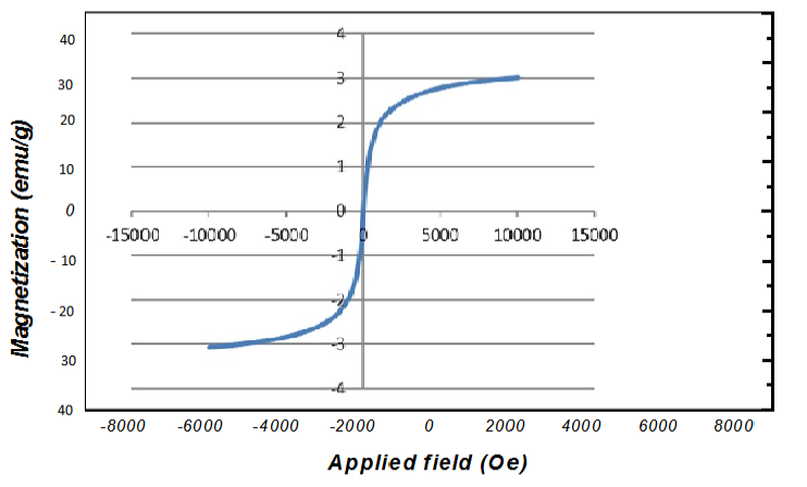 The hysteresis curve of magnetite was obtained using a magnetometer at a temperature of 25 ºC according. The nanoparticles show the super-paramagnetic behavior without magnetic hysteresis, in other words, they show magnetic properties of 80 emu/g in the presence of a magnetic field with increasing field strength up to about 8000 Gauss. But as soon as the magnetic field is removed, these particles completely lose their magnetic properties (0 emu/g). Therefore, magnetic orientations is observed in the presence of the externan magnetic field, and it disappear by removing the ecternal field. So, we can conclude that Fe3O4 is a super-paramagnetic particle that shows a strong magnetic property of 80 emu/g by applying a magnetic field, and the magnetic nanoparticles spread with a gentle shake as soon as this field is removed. This property of magnetic nanoparticles is important in their wide applications in biomedical and bioengineering disciplines.