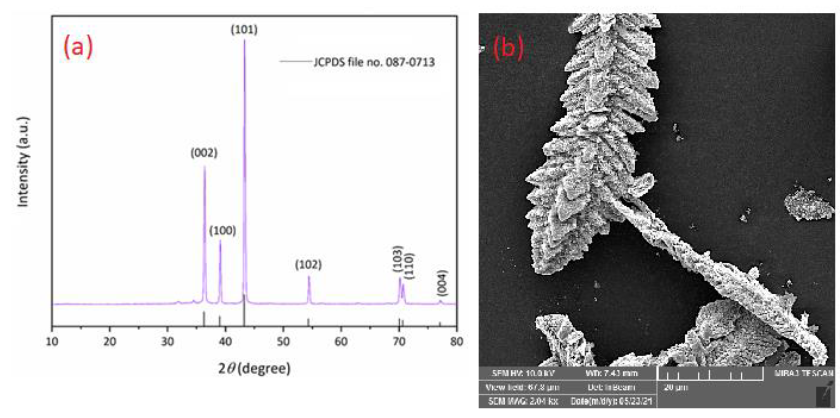 The XRD pattern and SEM image for the prepared dendritic zinc powder at current density of 250 mA cm-2 (as optimal sample) were represented in Fig. 4a and 4b, respectively. The XRD pattern (Fig. 4a) shows the electrodeposited zinc powder has the hexagonal structure without any phase impurity. The diffraction plans indexed to (002), (100), (101), (102), (103), (110) and (004) are clearly matched with the hexagonal phase for zinc metal (JCPDS file no. 087-0713). In addition, SEM image (Fig. 4b) reveals that the electrodeposited zinc powder has the dendritic morphology with length of 36.89 µm.