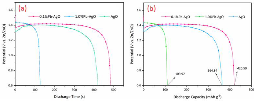 To study the electrochemical properties of the prepared n%Pb-AgO cathodes and to find how Pb additive affect discharge efficiency of the AgO cathode active material, the galvanostatic discharge of n%Pb-AgO cathodes were carried out at the constant current density of 250 mA cm-2.