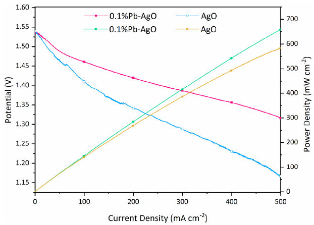 The polarization curves for AgO and 0.1%Pb-AgO cathodes was shown in Fig. 6. As respected, the AgO cathode containing 0.1% Pb additive represents lower polarization under current density of 500 mA cm-2. So that, the AgO cathode as a sole cathode active material has higher potential drop (0.13 V) compared to the 0.1%Pb-AgO cathode. In addition, Fig. 6 shows the power density for the AgO cathode is increased after introducing Pb additive into the structure of the AgO. The power density for the 0.1%Pb-AgO cathode shows increasing by 13% compared to the pure AgO cathode.