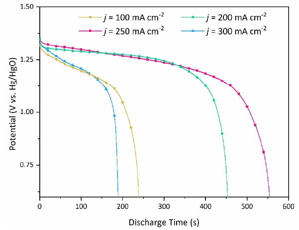 The electrochemical properties of the prepared electrolytic zinc powder samples were investigated using the galvanostatic discharge of the prepared zinc anode at current density of 250 mA cm-2. As above mentioned, different current density were applied to electrodeposit the zinc powder from zincate solution. Fig. 7 shows the comparison between the different electrolytic zinc samples prepared under different applied current densities. Clearly, the sample prepared at current density of 250 mA cm-2 has longer discharge time than other samples prepared at current densities of 100, 200 and 300 mA cm-2.