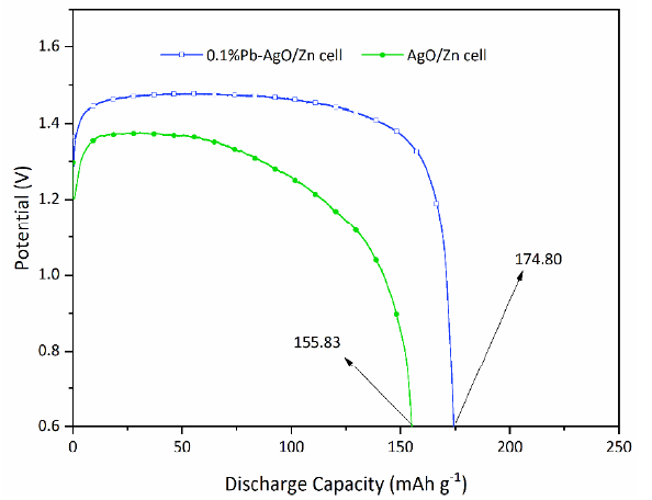 Fig. 8 shows the galvanostatic discharge of the prepared n%Pb-AgO/Zn cells (n = 0% and 0.1%) at current density of 300 mA cm-2. Clearly, at cut of voltage of 0.6 V, the cell including 0.1%Pb-AgO cathode has higher discharge capacity (174.8 mAh g-1) with respect to the cell containing the pure AgO (155.83 mAh g-1) as the sole cathode active material. As above mentioned, the enhanced performance of the cell is properly attributed to the significant decrease in the electrical resistivity of AgO cathode material after the introduction of Pb additive into the AgO structure.