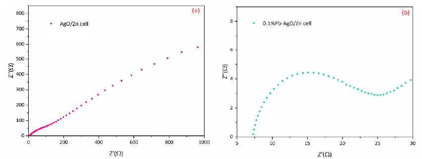 Fig. 9a and b show the EIS analysis for the prepared AgO/Zn cells including different cathode materials (0.1%Pb-AgO and AgO). The impedance spectra disclose that the cell comprising AgO cathode with 0.1% Pb additive has lower charge transfer resistance (14.55 Ω) compared to the cell with pure AgO cathode (57.08 Ω). Clearly, the Pb additive has significant ability to decrease charge transfer resistance of AgO cathode which lead to the facilitated charge transfer reactions in the AgO/Zn cell.