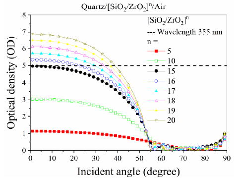 The main wavelength in this paper is 355 nm, therefore, OD for 355 nm on the structure with 5, 10, 15, 16, 17, 18, 19 and 20 stacks of [SiO2/ZrO2] versus incident angles of 0 to 90 degrees are calculated and shown in Fig. 9. Also, table 2 presents the safe incident angle range for 5, 10, 15, 16, 17, 18, 19 and 20 stacks of [SiO2/ZrO2]. The results show that n = 1, 5, 10 and 15 stacks can’t be trusted and don’t offer any safety but for 16 stacks, users can make sure direct stroked laser beam with incident angles ranging from 0 to 22 degrees won’t cause any damage. By increasing the number of stacks up to 20, the user is safe against the direct strike ranging from 0 to 38 degrees.