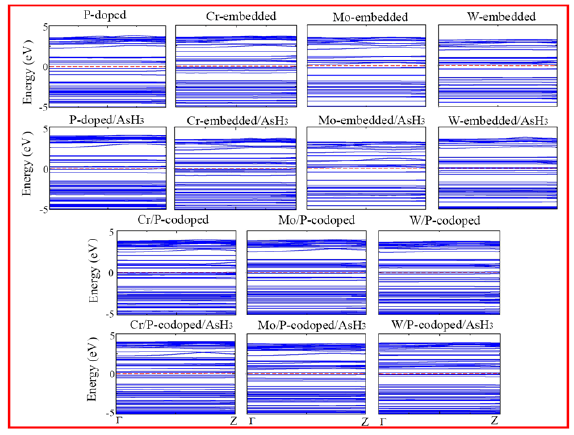 To further explore the effect of AsH3 gas adsorbing on the electronic characteristics of g-C3N4 systems, the band structures plots for P‒doped, Cr‒, Mo‒, W‒embedded, and also Cr/P‒, Mo/P‒, and W/P‒codoped g-C3N4 systems are demonstrated in Fig. 2 and also the corresponding data are listed in Table 2. It is worth noting that the Fermi energy level was set to zero energy scale (red dotted line). The results of band structures revealed that the Eg for a pure g-C3N4 at the DFT calculation is smaller than the experimental value (Eg=2.70 eV), because the GGA functional underestimate the fundamental gap energy. It should be noted that the underestimation of Eg in the present investigation will not affect the ultimate conclusion because we aim to make the comparison for the adsorption performance and electrical characteristics of pure and TM/P‒modified g-C3N4 systems with and without AsH3 molecules. As shown in Fig. 2, with adsorption of AsH3 molecules on the g-C3N4 and also codoping of Cr, Mo, W, and P atoms, the Eg of system (Eg=2.7 eV) is considerably decreased. Furthermore, it was found that the EF of g-C3N4 system upshifts into the conduction band edge after the adsorption of AsH3 molecules and also codoping of P and TM atoms, indicating the improvement of the conductivity of these modified g-C3N4 systems. Additionally, these results indicated that the AsH3‒adsorbed and TM/P‒modified g-C3N4 systems have semi-metallic properties because valence band and conduction band energy levels have not crossed each other at near the Fermi energy. Thus, it is inferred that the electrical conductivity of g-C3N4 systems are considerably modulated by adsorption of AsH3 and also codoping with Cr, Mo, W, and P atoms (see Table 2).