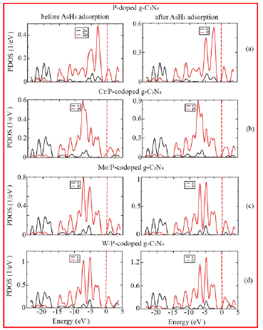 In order to further explain the electronic characteristics of the g-C3N4 systems, the partial density of states (PDOS) for the Nedge orbitals of the P‒doped, Cr‒, Mo‒, W‒embedded, Cr/P‒, Mo/P‒, and W/P‒codoped g-C3N4 compounds before and after adsorption of AsH3 molecules are demonstrated in Fig. 3. From this figure, we can see that with codoping of Cr, Mo, W, and P elements and also adsorption of AsH3 molecules on the g-C3N4, electron density close to the Fermi energy state for Nedge elements in these g-C3N4 systems remarkably increase, which is caused owing to the strong overlapping between orbitals of the different elements in the g-C3N4 systems and AsH3 gas. This shows that there is a considerable charge transfer between AsH3 gas and modified g-C3N4. In addition, it can be inferred that the sharp peak close to EF for the Nedge element in AsH3‒adsorbed W/P‒codoped g-C3N4 is more than those of the Cr/P‒, Mo/P‒ codoped compounds, which reveals a strong interaction energy between W element and AsH3 gas. Based on these results, it can be stated that the strong orbital hybridization between Cr, Mo, and especially W atoms and AsH3 gas enhances the gas adsorption ability of the g-C3N4 compounds to this toxic gas.
