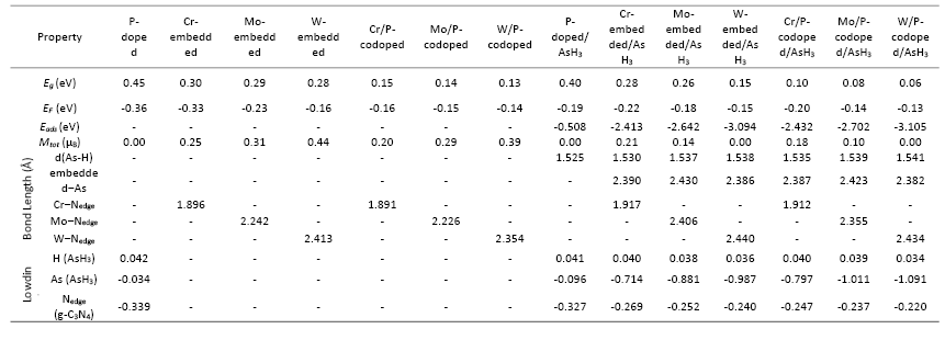 The total induced magnetic moment (Mtot) and geometrical parameters of AsH3 gas adsorbed over the P‒doped and Cr/P‒, Mo/P‒, and W/P‒modified g-C3N4 systems such as As–H bond length (dAs-H), TM‒Nedge bond length, and distance between As atoms of arsine molecules and these TM elements are listed in Table 2. As seen, the magnetic moment for W/P‒codoped (Mtot=0.39 µB) is higher than those of the Cr/P‒ and Mo/P‒modified g-C3N4 systems, because the weak interaction between Nedge and W atoms causes induced magnetic features in this system. Furthermore, it can be realized that with adsorption of AsH3 molecules on the W/P‒codoped g-C3N4, the Mtot reduces from 0.39 to 0.00 µB. This phenomenon attributed to strong overlapping between orbitals of W and As atoms. In addition, the bond lengths of As–H are 1.525 Å (P‒doped), 1.535 Å (Cr/P-codoped), 1.539 Å (Mo/P-codoped), and 1.541 Å (W/P-codoped) having a considerable variation in comparison with the bond length of free AsH3 gas (1.520 Å). From Table 2, it can be observed that the bond lengths of TM‒Nedge significantly change after adsorption of AsH3 molecules over the TM/P‒modified g-C3N4 compounds. It should be noted that the elongation of dAs-H in AsH3‒adsorbed W/P‒codoped g-C3N4 is higher than those of the other TM/P‒codoped systems. This phenomenon is mostly ascribed to the large electron transfer from the W/P‒codoped g-C3N4 to AsH3 gas. The maximum value of Eads for AsH3 adsorbed on the W/P‒codoped g-C3N4 with the smaller distance between W and AsH3 molecules indicating strong chemisorption for AsH3 on this system (see Table 2).