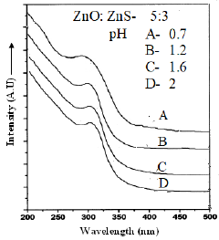 The ZnO-ZnS nanocomposite prepared by chemical process in optimum conditions showed sharp absorbance beyond its band edge wave length 350 nm. Absorption spectra also show that the optimum pH value for larger blue shift and correspondingly for smaller dot.