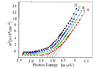 The energy band gap was calculated from Fig. 2. using a graph graph (αhʋ)2 versus hʋ .From the graph band gap were calculated extrapolating the function straight-line to to (αhʋ )2 = 0. From the shifting of band gap, radius of the particles is calculated using mass approximation model(EMA) [2].