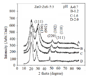 Fig. 3. shows four different spectra of ZnO-ZnS nanocomposite thin film form prepared at different pH of the solution ranging from 0.7 to 2.0. The XRD spectrum of A contain broad peaks at 2θ =29.370, 47.324 indicating growth of nanostructure at pH =0.7. B also shows the peaks at 2θ =29.131, 47.164,C at 2θ =28.942,46.763 and D at 2 θ =28.752,46.457 for pH value 1.2, 1.6 and 2.0 respectively. The spectrum shows diffraction peaks corresponding to (111), (220) planes of Zinc blende(sphalerite) phase (JCPDS card, No. 5-0566) and (100),(002),(102),(110) for composite ZnO-ZnS. The XRD spectrum of all the spectra exhibit weak and broad peaks, suggesting small crystallite size. Again, it was observed that pH decreases more broadening take place with decreasing in crystallite size [4-6].