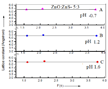 Since we used a simple chemical process for composite thin film so possibility oftwins formation can be neglected. Therefore, XRD peak broadening was considered only for size. The lattice parameter ‘a’ was determined with corresponding planes and systematic errors in 2 θ were eliminated by Nelson and Riley plot in from three peaks. The corrected value of lattice constant “a” is calculated by F(θ) to zero. The lattice constant was explained in Fig. 4.