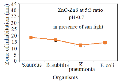 The bacteria were cultured at -4°C. Antibacterial process were done at optimized smallest particle at different pH value. The nutrient agar plates were applied for 3.0 ml of inoculums and swab over the region. 6mm diameter were cut on the agar plates and the wells are placed with ZnO-ZnS nanoparticles. Standard antibiotic (Tetracyclin) was maintained for control the positive effect.
