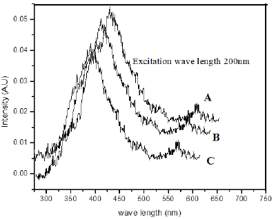 For PL analysis the wavelengths were applied in between 250 nm to 400 nm. Fig. 7. Shows result of luminescence of ZnO-ZnS composite at 5:3 ratio and at different pH A-0.7,B-1.2 and C-1.6. All luminescence spectra clearly show that prepared samples have emission peak with high intensity at longer wave length. Another peak of smaller intensity is also observed at higher wave length