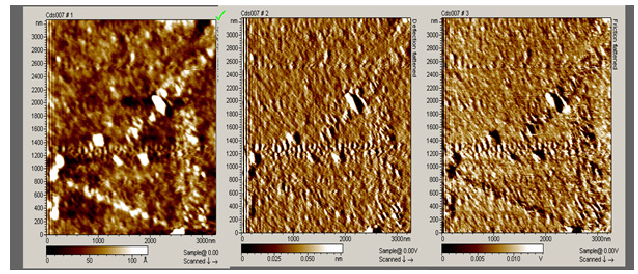 Fig.8. AFM direct image of ZnO-ZnS at 5:3 ratio and pH-0.7 in with sun light our optimum antimicrobial effect. The TEM image shows that the size of the particle was spherical in shape and found in the range 5-8nm which was a good similarity as size obtained in optical model. Fig. 9 represent the SEM photograph of ZnO:ZnS nanocomposite at optimum size and antimicrobial effect. It was found that some grains are overlap and showed different shape. The SEM photo images were not very sharp because of lower operating voltage (15KV). The images were observed at lower operating voltage to avoid sample damage. Higher operating voltage could have improved the image sharpness and resolution [20-25]. Fig.10 showed the AFM (contact mode) images of the ZnO-ZnS nanocomposite at different pH ranging.