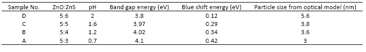 Table 1 Blue shift energy and particle size from optical model of ZnO-ZnS at different pH. Optical absorption and band gap estimation suggest that the composite material consist of single-phase cubic structure.