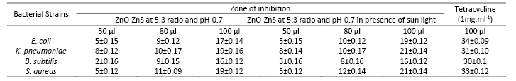 Tetracyclin of 1mg/ml, concentration was perform control antibacterial agent. The results in Table-2 depict that Fe doped ZnO-ZnS nanoparticles are efficiently giving zone of inhibition. Table 2. Antibacterial efficacy of ZnO-ZnS nanopareticles with standard antibiotic in bacterial strains