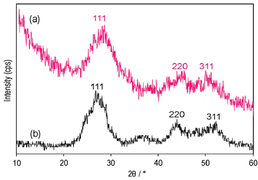 The crystalline structures and phase purities of L- and D-cyst-CdS-QDs were studied by XRD analysis and their patterns presented in Fig. 2. The observed peaks in the XRD patterns of L- and D-cyst-CdS-QDs correspond to the crystal planes of cubic CdS phase (JCPDS reference code 41-1049) [25]. Also, with application of Debye-Scherrer formula [26] for the peak (111), the average crystallite sizes of L- and D-cyst-CdS-QDs were calculated as 3.4 and 3.6 nm, respectively.