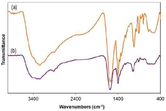 In the FT-IR spectra of L- and D-cyst-CdS-QDs (Fig. 5), the peaks at 1550-1600 cm-1 and 3000-3500 cm-1 belong to the stretching vibrations of COO- and OH groups of cysteine species, respectively. The observed bands in the range of 2900-3000 cm-1 can be assigned to the stretching vibrations of C-H bonds. Furthermore, the stretching vibrations of S-H groups are not seen at about 2500 cm-1 indicating the formation of covalent bonds between sulfur group of cysteine and the surface of CdS-QDs [9]. These observations confirm the successful surface chemical functionalization of CdS-QDs with L- and D- cysteine species.
